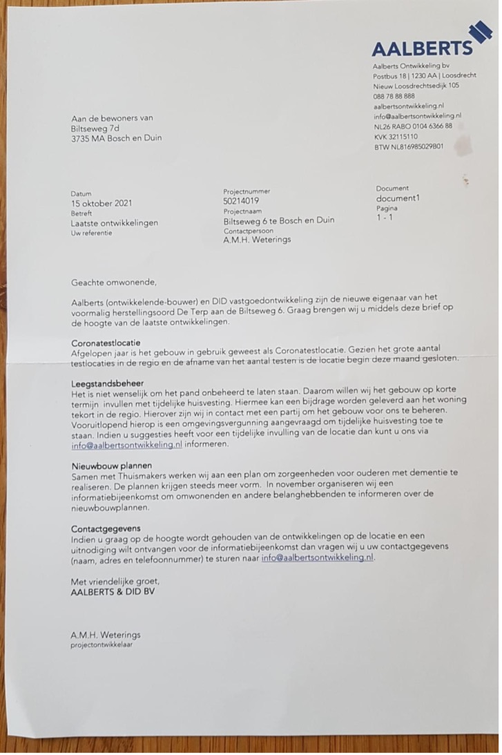 De projectontwikkelaar heeft een brief naar omwonenden gestuurd en heeft een omgevingsvergunning voor tijdelijke huisvesting voor 2 jaar ingediend bij de gemeente. Hiermee zou de bestemming wijzigen van maatschappelijk naar wonen. Na deze tijdelijke huisvesting wil de projectontwikkelaar zorgeenheden voor ouderen met dementie gaan realiseren. Lees: Brief van de projectontwikkelaar Biltseweg 6